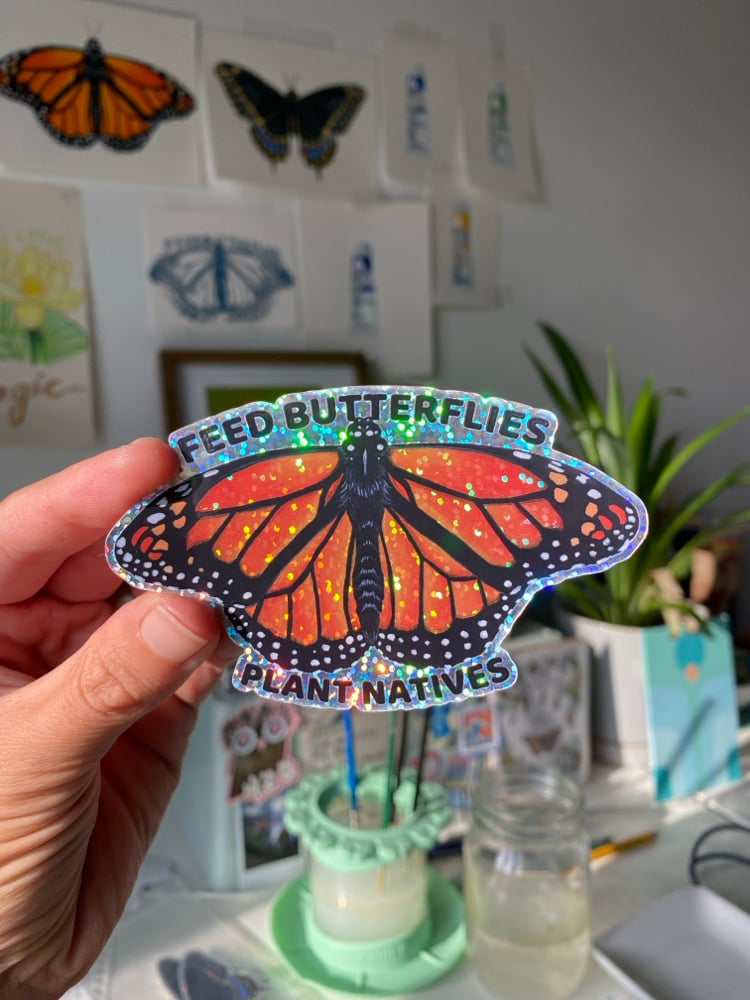 Let the world know, Feed Butterflies, Plant Natives with this monarch sticker. Flawless glossy finish with heavy large glitter on the wings and background, it’s perfect way to catch eyes and spread awareness to the importance of planting native plants!